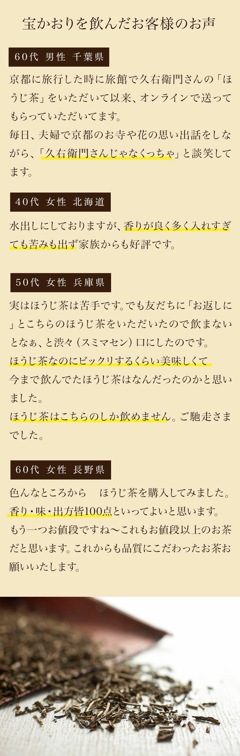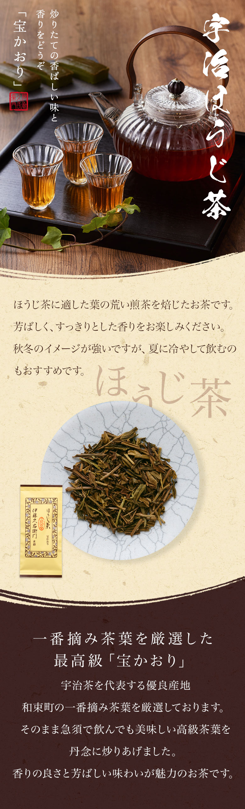 一番摘み茶葉を厳選した、当店最高級「宝かおり」、そのまま急須で飲んでも美味しい高級茶葉を丹念に炒り上げました。香りの良さと香ばしい味わいが魅力のお茶です。(「都かおり」は二番茶を主に使用しております)。