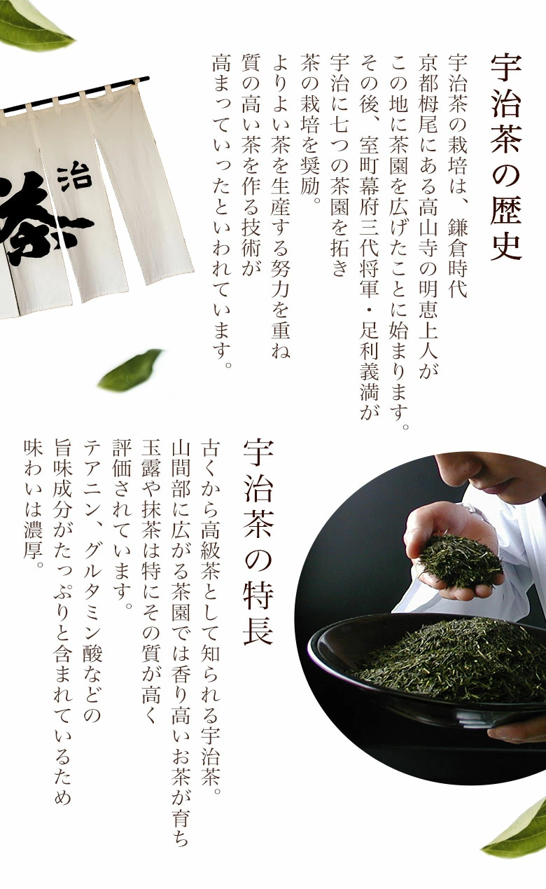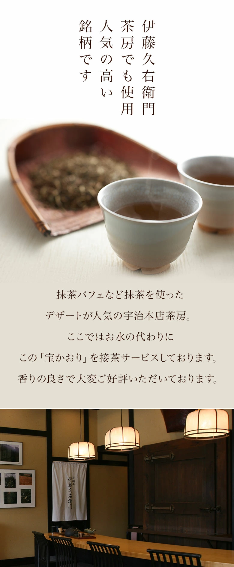 伊藤久右衛門茶房でも使用、人気の高い銘柄です。抹茶パフェなど抹茶を使ったデザートが人気の宇治本店茶房、ここではお水の代わりに「宝かおり」を接茶サービスしております。香りの良さで大変ご好評いただいております。