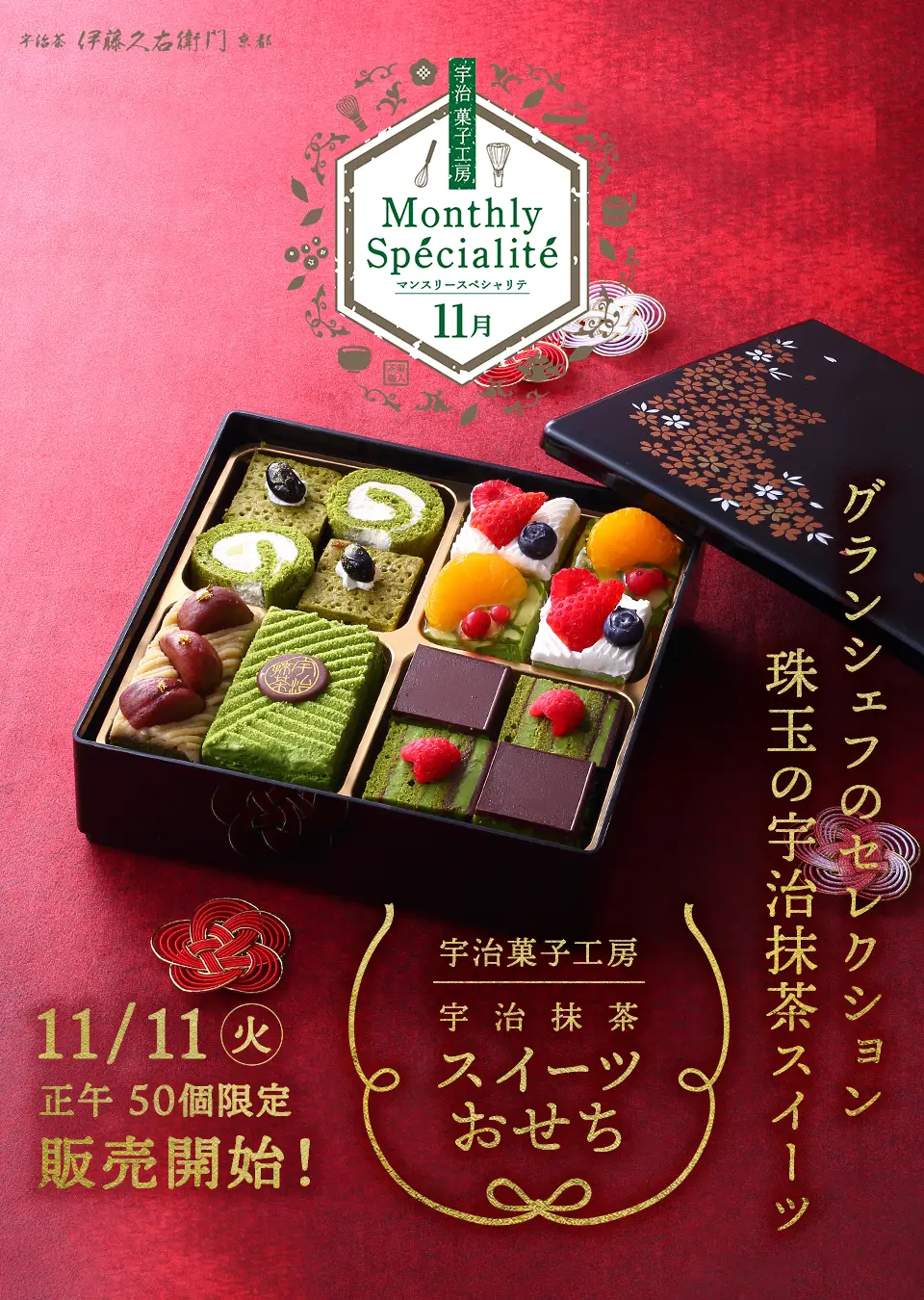 宇治菓子工房がお届けする特別な月替りスイーツ「Monthly Specialite マンスリースペシャリテ」。11月は「宇治抹茶スイーツおせち」を数量限定でお届けします。