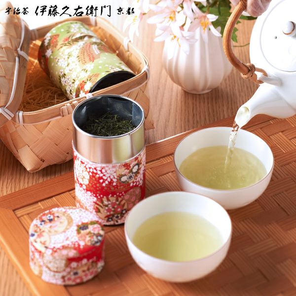 そんなお茶を、友禅和紙を使用した茶缶と趣深い竹かごに詰めました。