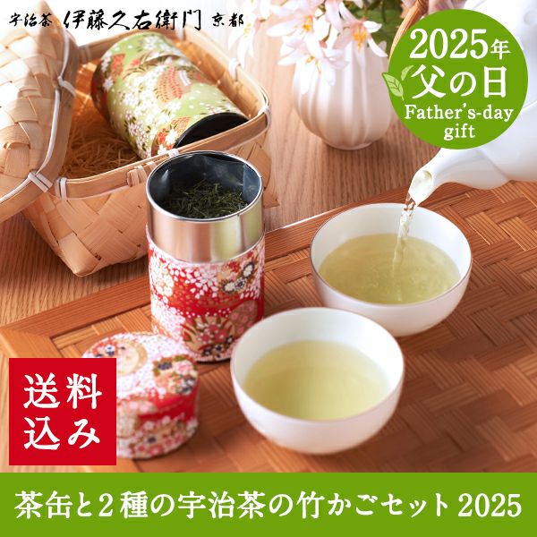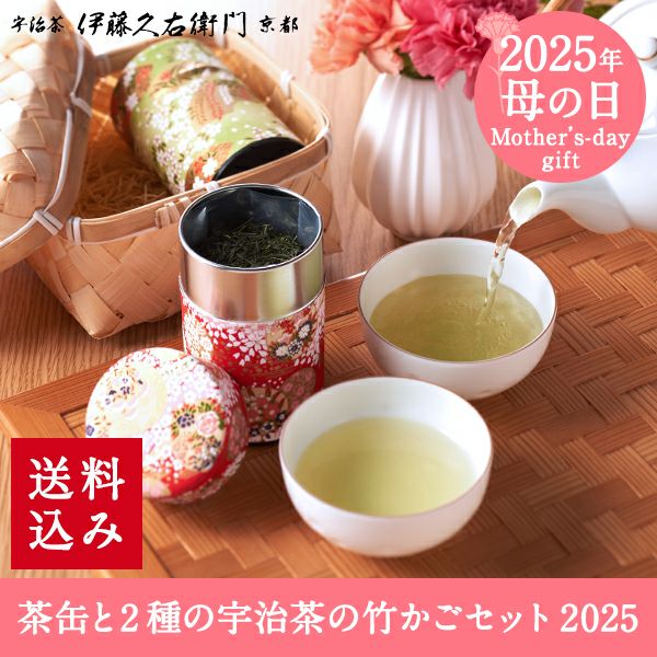 ナチュラルな竹かごに華やかな茶缶を収めたオリジナル宇治茶ギフトをお届けします。宇治茶は、「宇治煎茶」と「宇治玉露」の2種をご用意しました。