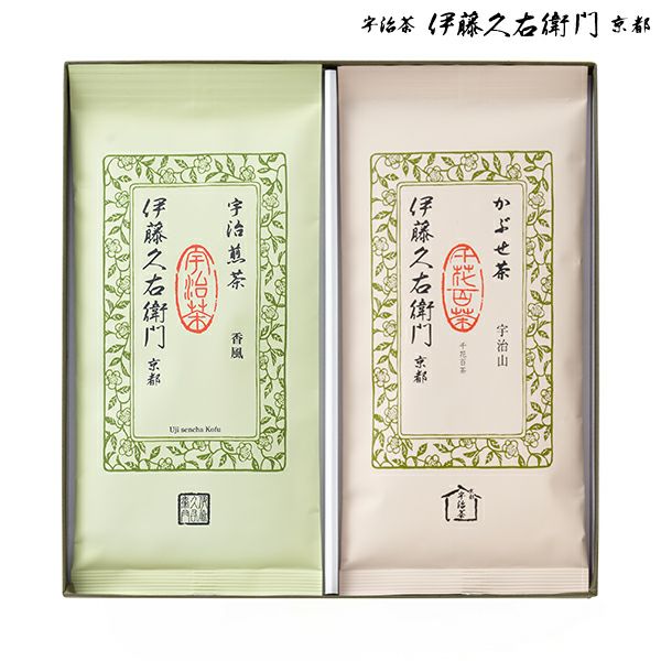 新緑の五月に摘んだ一番茶に夏摘みの二番茶を程よくブレンドした宇治煎茶「香風(旧 : さみどり)」。熱湯でもまろやかな味わいが楽しめるかぶせ茶「宇治山」。宇治を代表する二銘柄を化粧箱に詰め合わせました。伝統の手技で育まれた生粋の宇治茶をお贈りします。