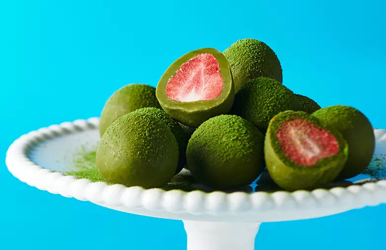 苺をまるごとフリーズドライして、上薄茶用抹茶のチョコレートでコーティング、抹茶もいちごもチョコもすべて楽しめる苺トリュフができました。