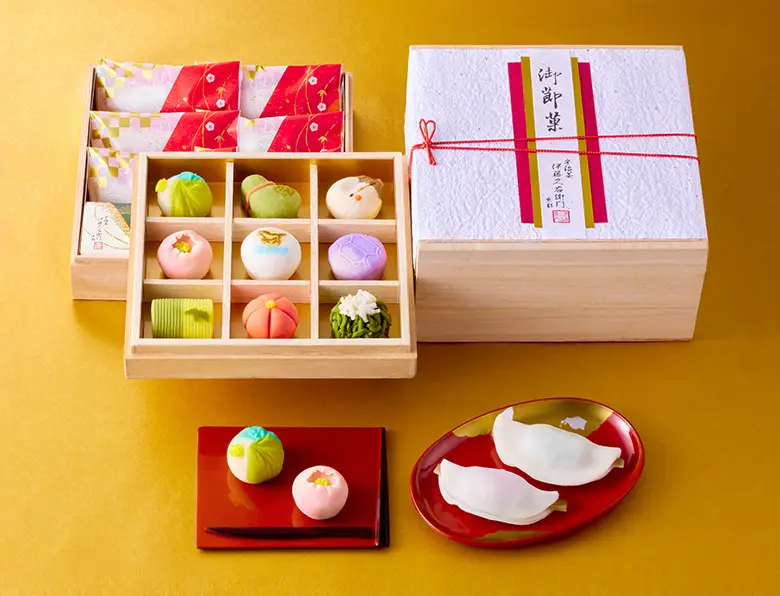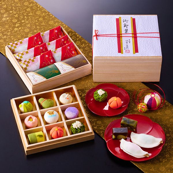 9品の華やかな「上生菓子」に、京都の伝統的な祝い菓子「花びら餅」と宇治茶を使った「羊羹」を加え、高級感のある桐の二段重にお詰めいたしました。