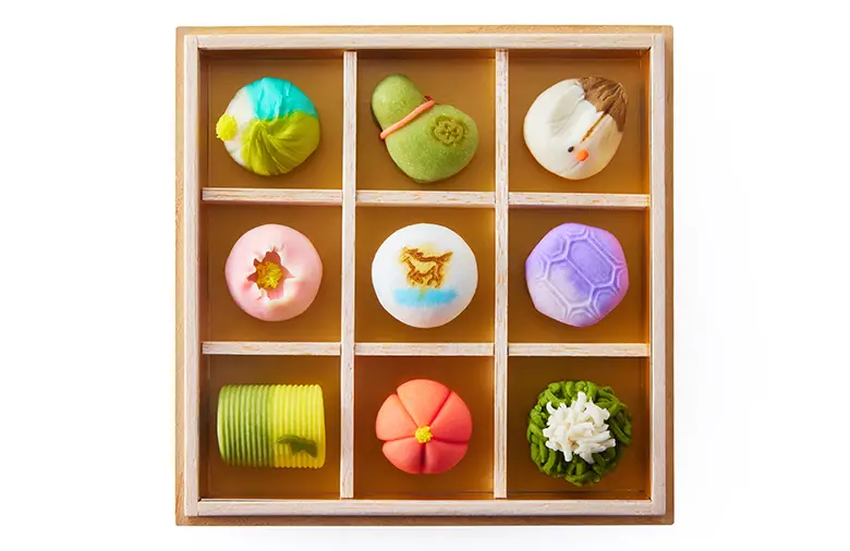 一の重には5種の宇治茶を使った彩り豊かな9品の「上生菓子」を詰めました。