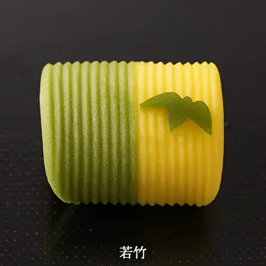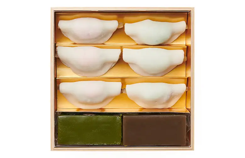 ふっくらとした白い求肥餅に緑色の求肥餅を重ね、ほうじ茶を加えた白味噌餡と甘く煮たごぼうを包みました。やわらかくコシのある求肥餅の食感と芳ばしいほうじ茶の香り、風味豊かなごぼうの絶妙なバランスをお楽しみください。