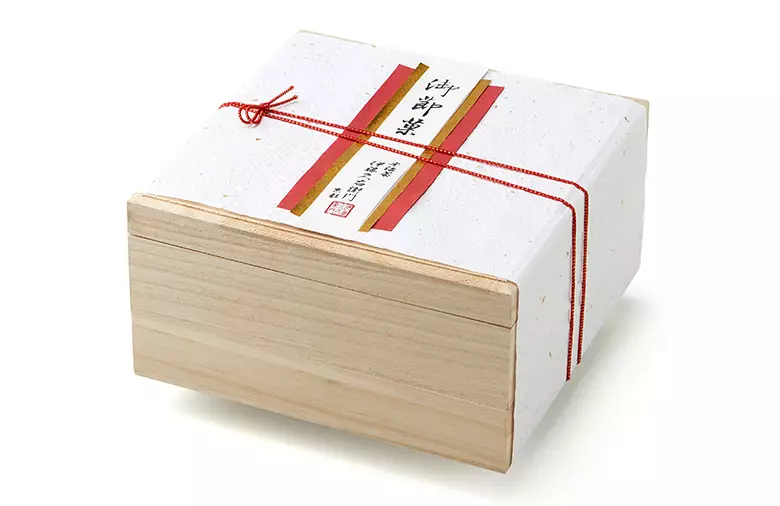新年を祝う晴れやかな迎春菓子13品を、二段重の桐箱でお届けします。香り高い宇治煎茶3種も添えてお届けします。