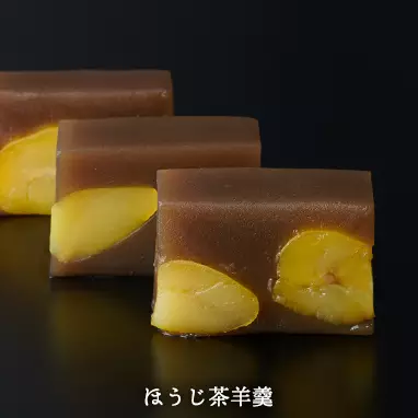ほうじ茶を練り込んだ羊羹に、栗をふんだんに入れて贅沢に仕上げました。ほうじ茶の芳ばしい香りとやわらかい口あたりが特長です。