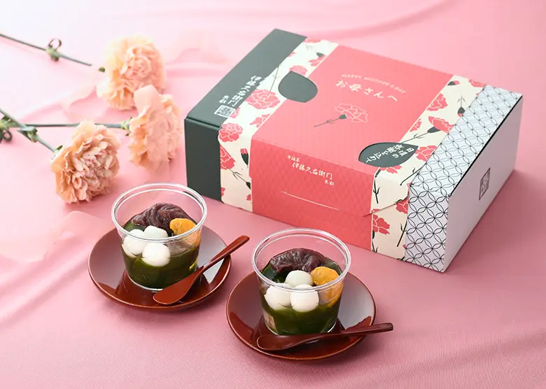 [TVで話題]芸能人のおもたせランキングに入選し大ブレイクした抹茶あんみつです。濃厚抹茶ゼリー、歯ごたえの良い寒天に北海道産小豆。オリジナルデザインの母の日スリーブで大切なお母さんに感謝をお届けします。