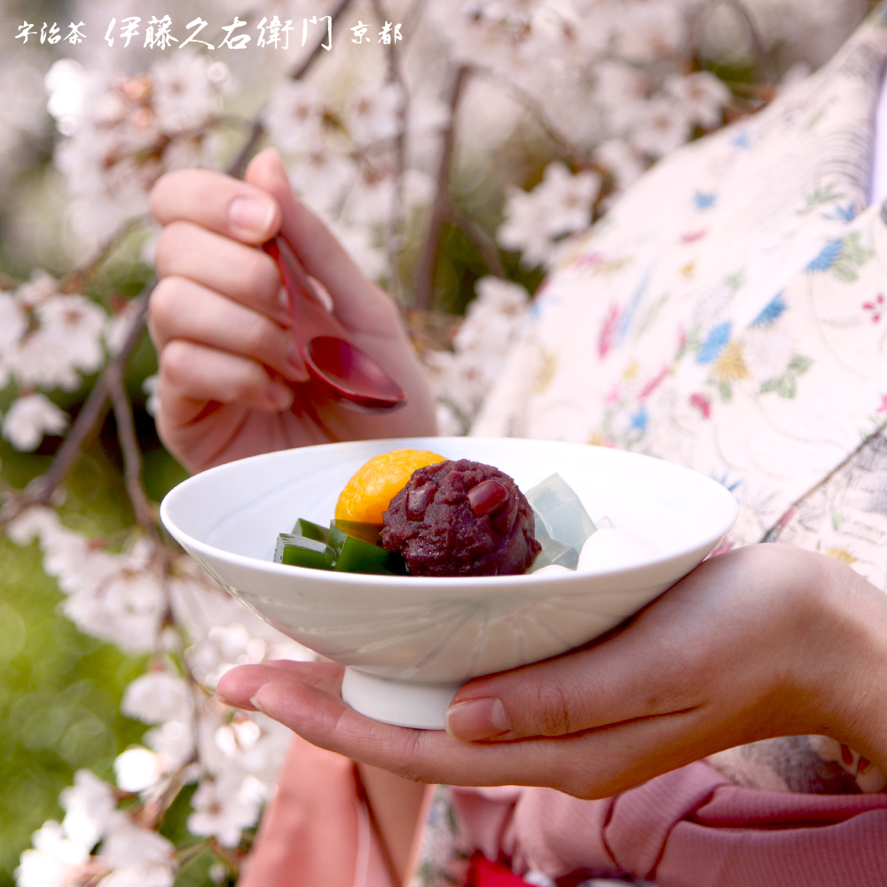 宇治本店・茶房のオープン時よりメニューに並び、抹茶の豊かな風味が楽しめると大変好評をいただいている抹茶あんみつ。