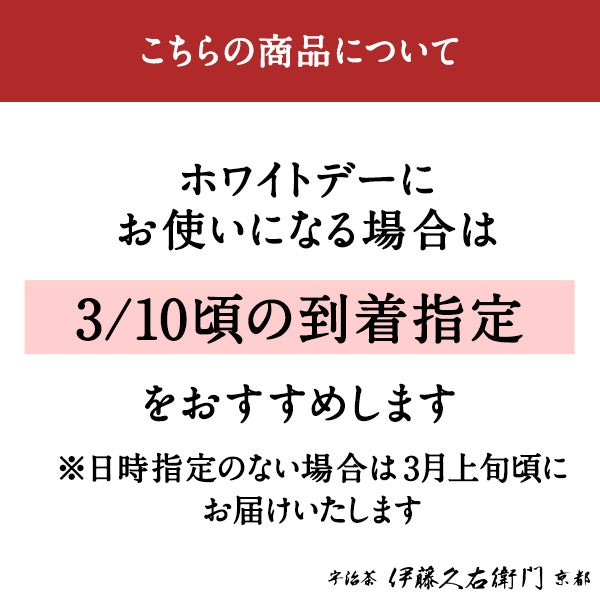 他の画像を見る 翌日お届け対応 冷蔵便 包装不可 のし不可 キャンセル不可 宇治茶生チョコレート尽くし(抹茶・ほうじ茶)≪2026ホワイトデーギフト≫【翌日お届け可】 § 【2種類の生チョコをお得に食べ比べ】【数量限定】【期間限定】 抹茶スイーツ ほうじ茶スイーツ ちょこれーと プレゼント 090886 価格 ¥ 2,590 税込 販売期間 2026/01/05 6:00 〜 2026/03/20 17:00 商品詳細を見る お気に入りに登録する