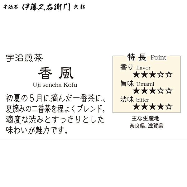 新緑の五月に摘んだ一番茶に夏摘みの二番茶を程よくブレンドした宇治煎茶「香風(旧 : さみどり)」。熱湯でもまろやかな味わいが楽しめるかぶせ茶「宇治山」。宇治を代表する二銘柄を化粧箱に詰め合わせました。伝統の手技で育まれた生粋の宇治茶をお贈りします。