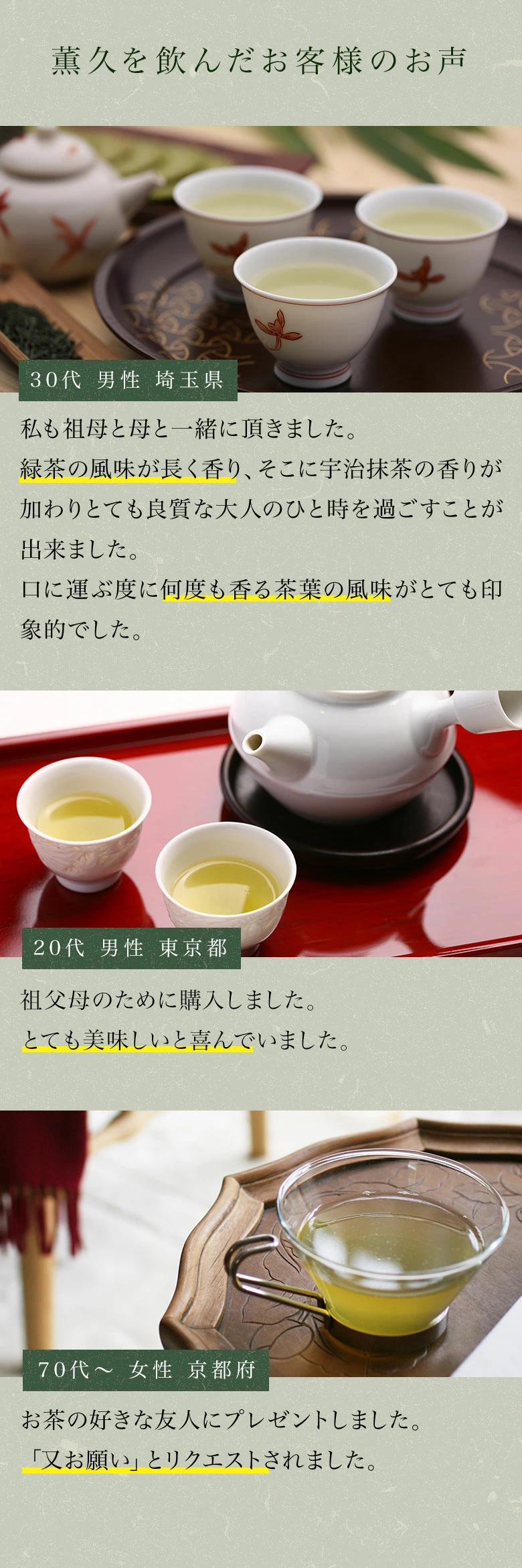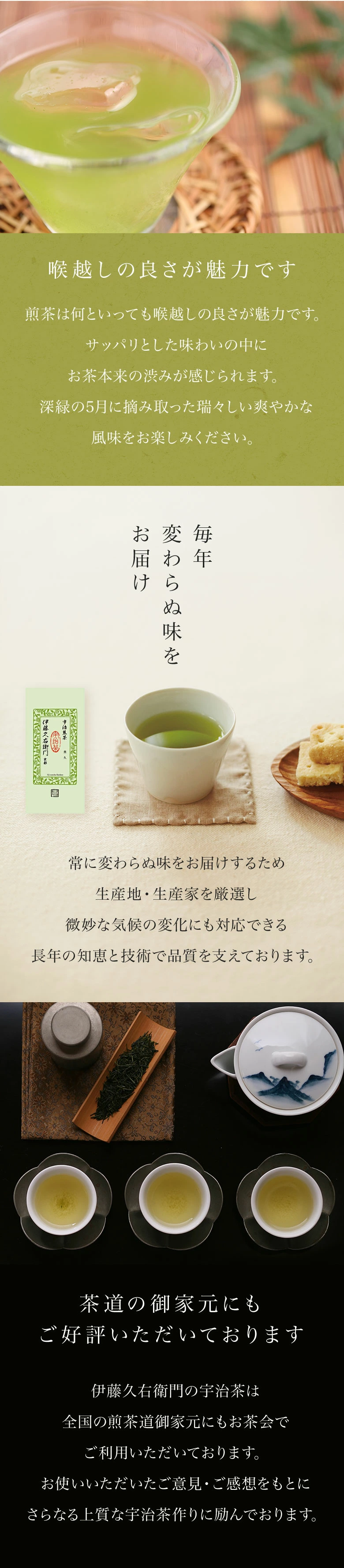 緑茶特有の成分であるカテキンが多く含まれております。香り高く清涼感のある味わいです。煎茶道、各流のお茶会にもご利用いただいております。