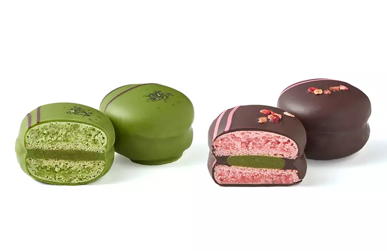 こだわりのガナッシュをサンドしたマカロンをチョコレートでコーティングした「ショコラマカロン」。「抹茶 & 抹茶」と「抹茶 & いちご」の2種のフレーバーをご用意しました。