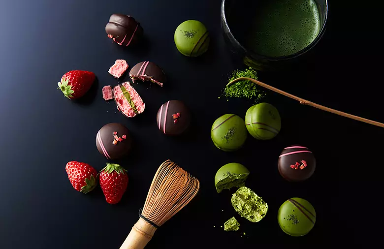 それぞれの味を引き立たせるため、抹茶にはホワイトチョコレートを、いちごにはビターチョコレートを合わせています。