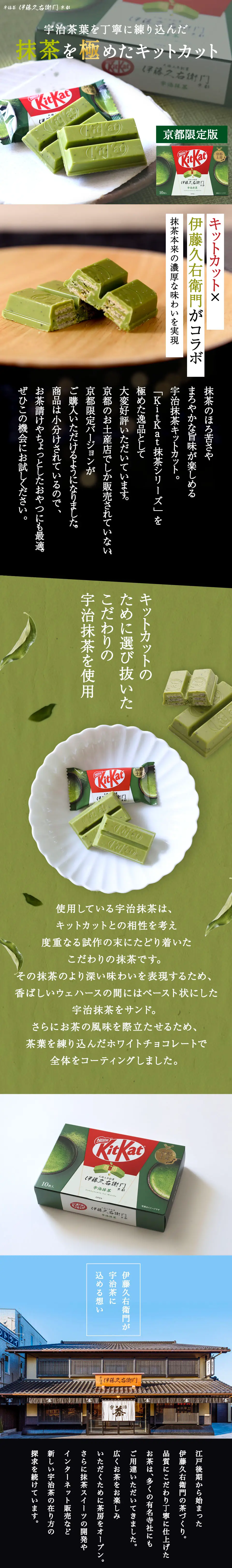 まろやかな味わいのチョコレートに、伊藤久右衛門が選りすぐった宇治抹茶を丁寧に練りこみました。かねてより人気の高い「Kit Kat 抹茶シリーズ」を極めた逸品です。