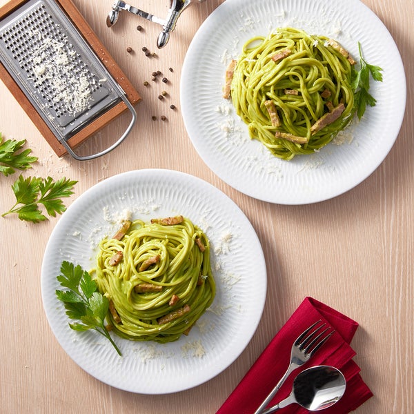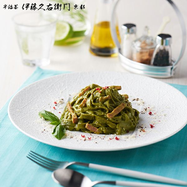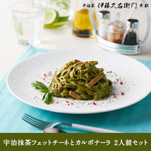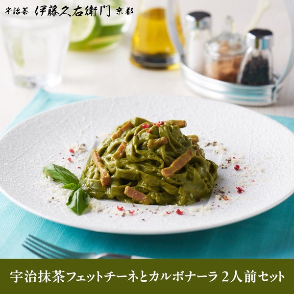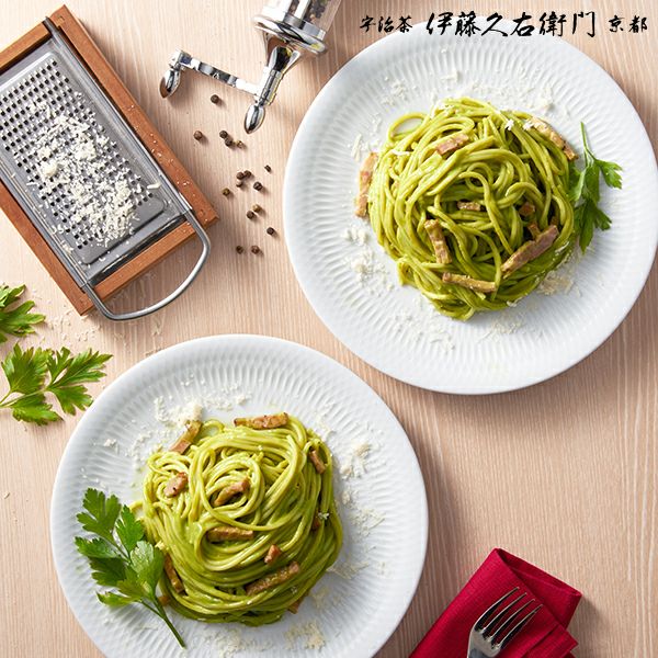 宇治抹茶フェットチーネと宇治抹茶カルボナーラを楽しめるセット商品をご用意しました。2人前。