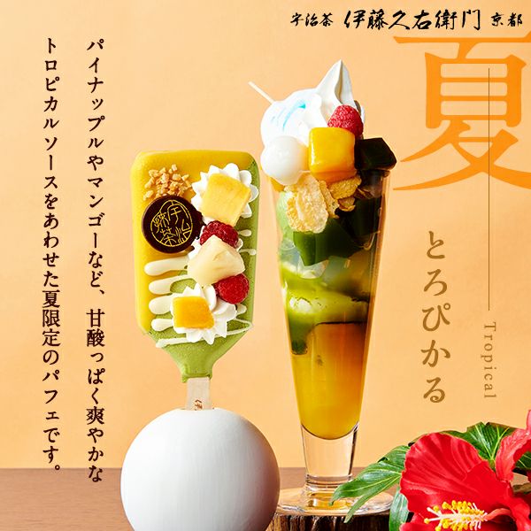 夏の抹茶パフェは、パイナップルやマンゴーなど、甘酸っぱく爽やかなトロピカルソースをあわせた夏限定のパフェです。