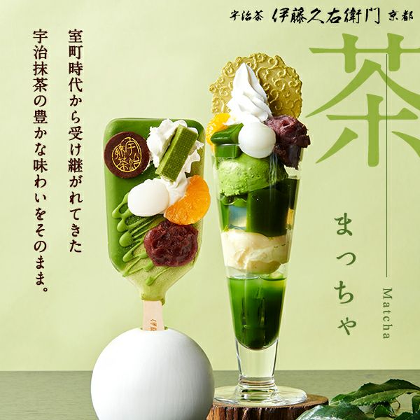宇治抹茶の魅力と相性の良い素材をふんだんに盛り込んだ、各種の宇治抹茶パフェ。