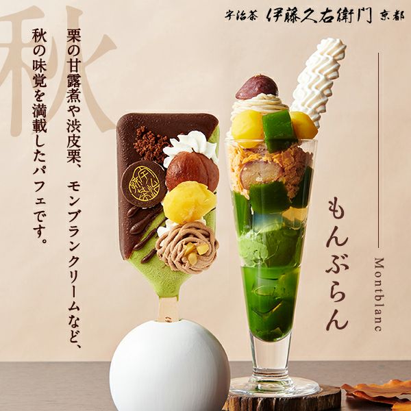 抹茶モンブランパフェは、栗の甘露煮や渋皮栗、口どけの良いモンブランクリームなど、秋の味覚を満載したパフェです。