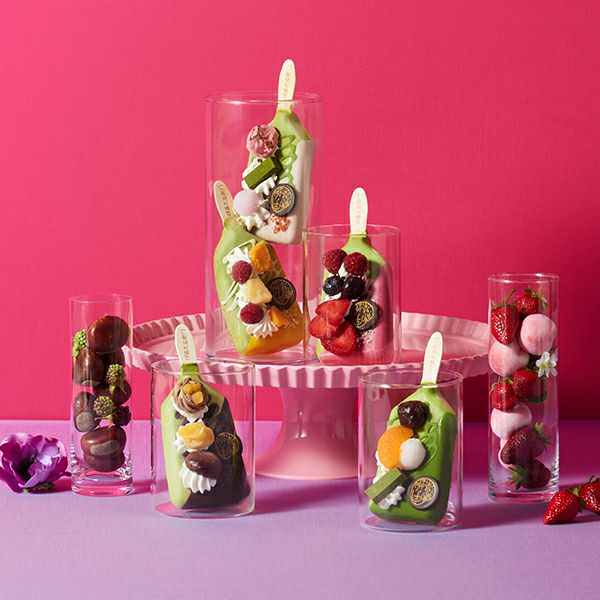 いちごと2種類のベリーをトッピングし、いちごチョコレートのコーテイングで愛らしいパフェアイスバーができました。