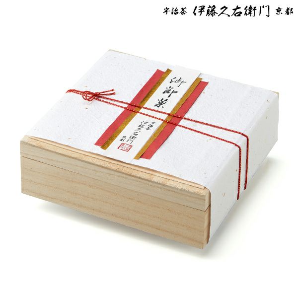 新年を寿ぐ祝い菓子9品をお正月らしい桐箱に詰め込みました。香り高い宇治煎茶も添えてお届けします。