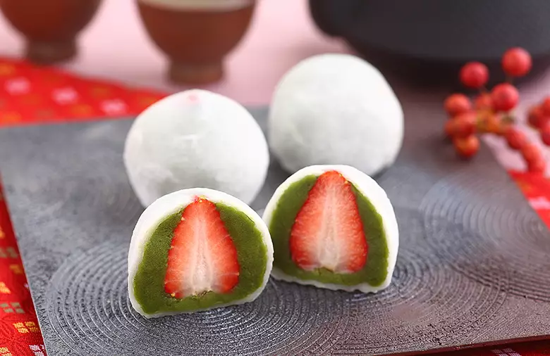 当店の抹茶スイーツの中でも大変人気の高い抹茶だいふくに、新鮮ないちごをまるごと1つ詰め込みました。