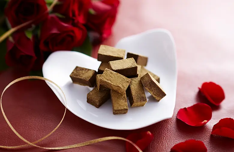 焙じ機で茶葉を褐色になるまで焙煎し、香味を向上させたものが「ほうじ茶」。このお茶の美味しさを存分に引き出した生チョコレートが完成しました。