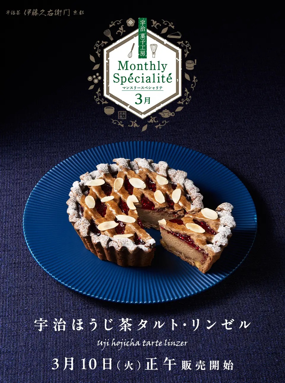 宇治菓子工房がお届けする特別な月替りスイーツ「Monthly Specialite マンスリースペシャリテ」。3月は「宇治ほうじ茶タルト・リンゼル」を数量限定でお届けします。