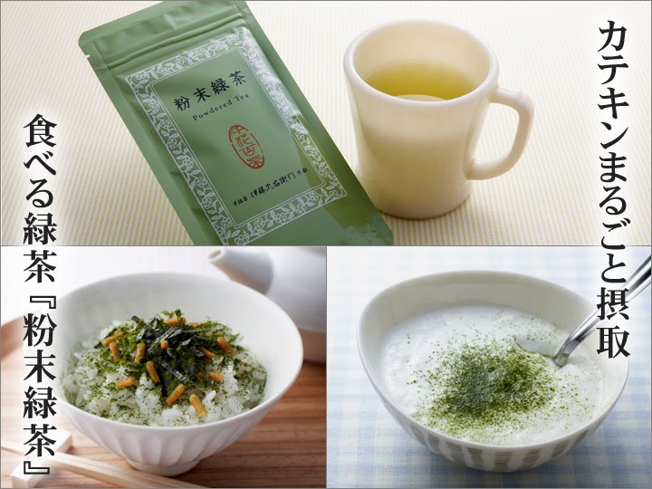 宇治茶のおいしさをまるごと粉末にしました。緑茶のもつ有効成分であるカテキンやタンニンをまるごと摂取していただけます。