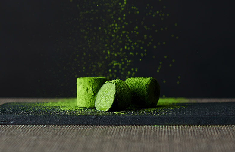 最初に、宇治抹茶の鮮やかな緑とほろ苦さが。次に、とろける生チョコレートの甘さ。そしてふたたび、抹茶の香りが。