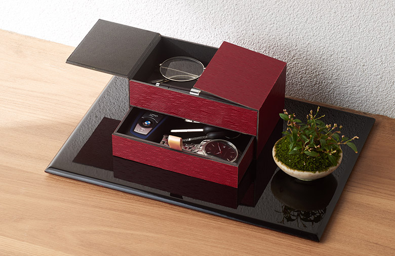 車のキーや腕時計など、ちょっとした小物入れにしたり、メモ帳やボールペン、ハンコなどの文房具ケースにも。