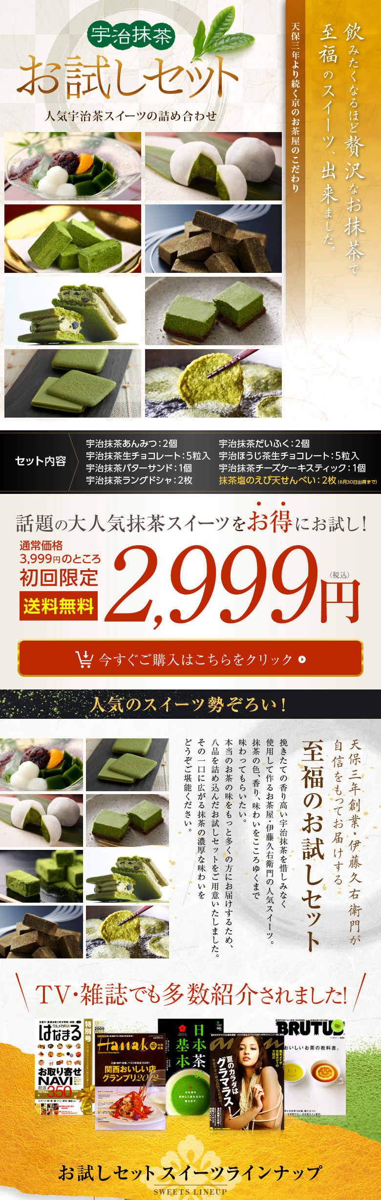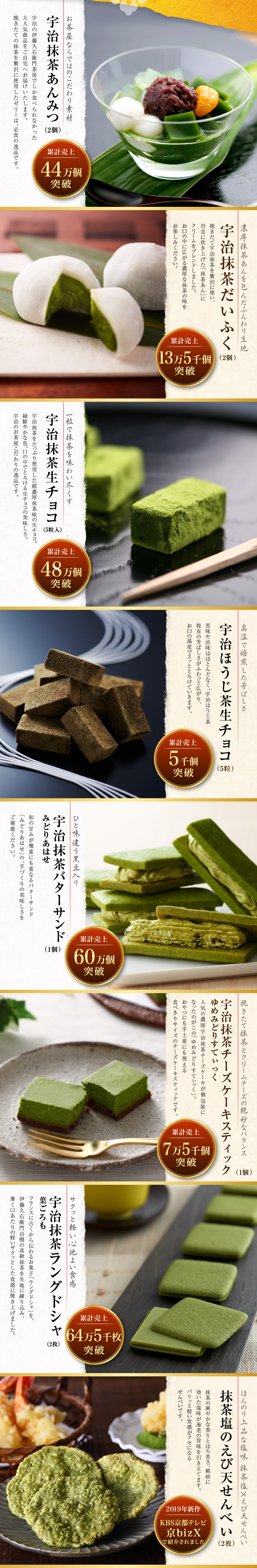 抹茶あんみつ・抹茶だいふく・抹茶生チョコレート・ほうじ茶生チョコレート・抹茶バターサンド・抹茶チーズケーキバー・抹茶ラングドシャ・抹茶塩のえび天せんべいを、お得な初回限定価格で。各種じっくりお試しいただけます。