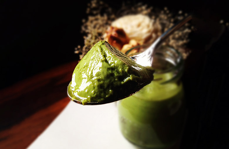 主張のない程度に混ぜ込むと、驚くほどに味が調えられ、抹茶の香りと味が浮き上がってきます。合わせて生クリームの濃厚さも強く打ち出す事ができました。