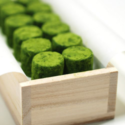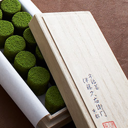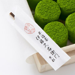 京都のお茶屋らしく和風のパッケージに仕上げました。円筒状の緑鮮やかなチョコを桐箱に詰め、手漉きと手揉みで仕上げた上質和紙でつつみ、最後に和紙の原料となる麻でつくった紐で結びました。