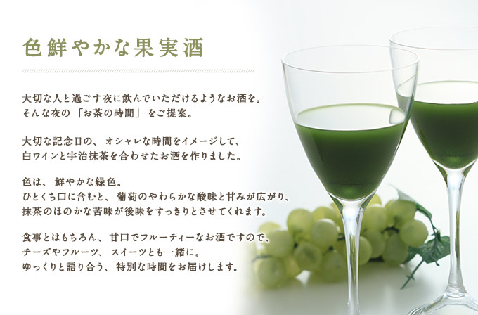 大切な記念日の、オシャレな時間をイメージして、 白ワインと宇治抹茶を合わせたお酒を作りました。食事とはもちろん、甘口でフルーティーなお酒ですので、チーズやフルーツ、スイーツとも一緒に。ゆっくりと語り合う、特別な時間をお届けします。