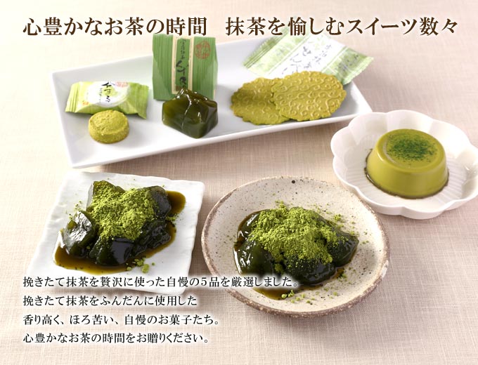 挽きたて抹茶を贅沢に使った自慢の抹茶菓子5品を厳選しました。心豊かなお茶の時間をお贈りください。
