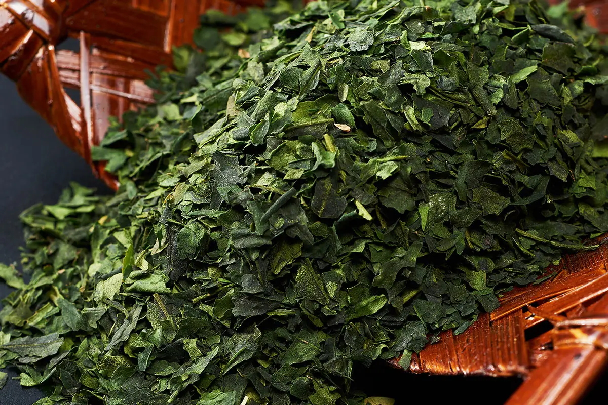 二番茶は一番茶に比べ苦味成分であるカテキン類の含有量が多いことから、抹茶の後味を強めたいスイーツに隠し味として配合しております。