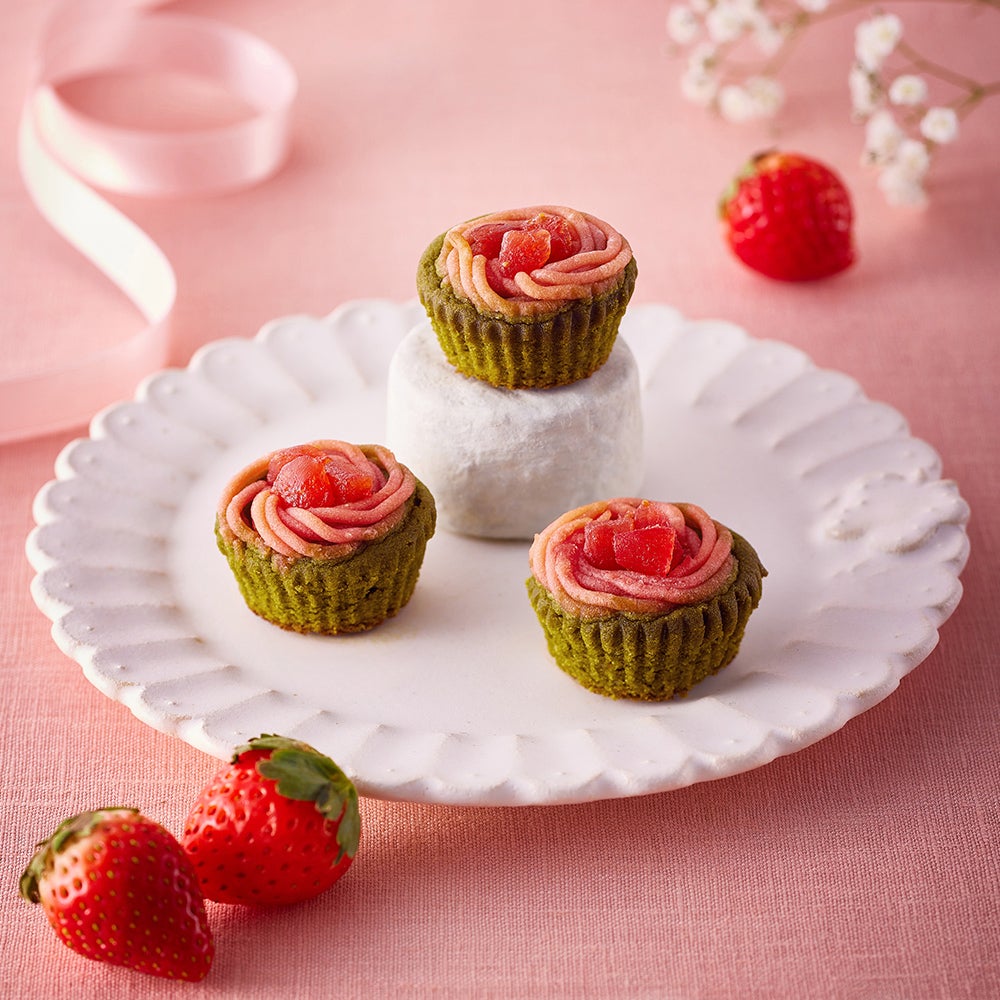 ころんとした可愛らしい見た目、と侮るなかれ。土台の抹茶ケーキはしっとり濃厚、ほのかな渋味と和の風味がふわりと広がり、その上には甘酸っぱくも優しい甘さの苺クリーム餡と、ドライフルーツの苺をトッピング。抹茶と苺の味わいが織り成す、お茶屋ならではの一品をご用意しました。