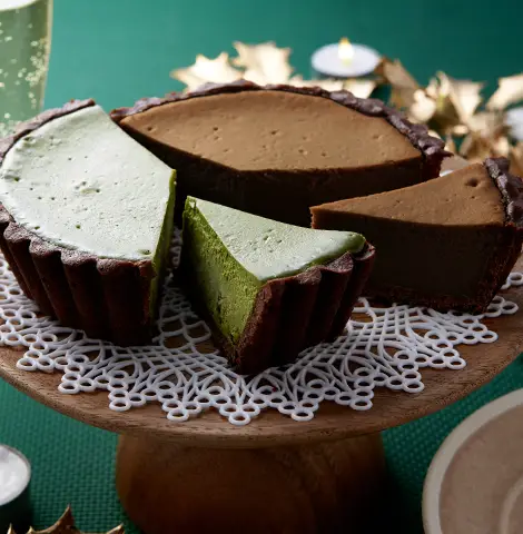 抹茶とほうじ茶の2つの味わいをご一緒に。量は半分ずつですが、美味しさと満足度は2倍です。お茶屋のチーズケーキの食べ比べをお楽しみください。